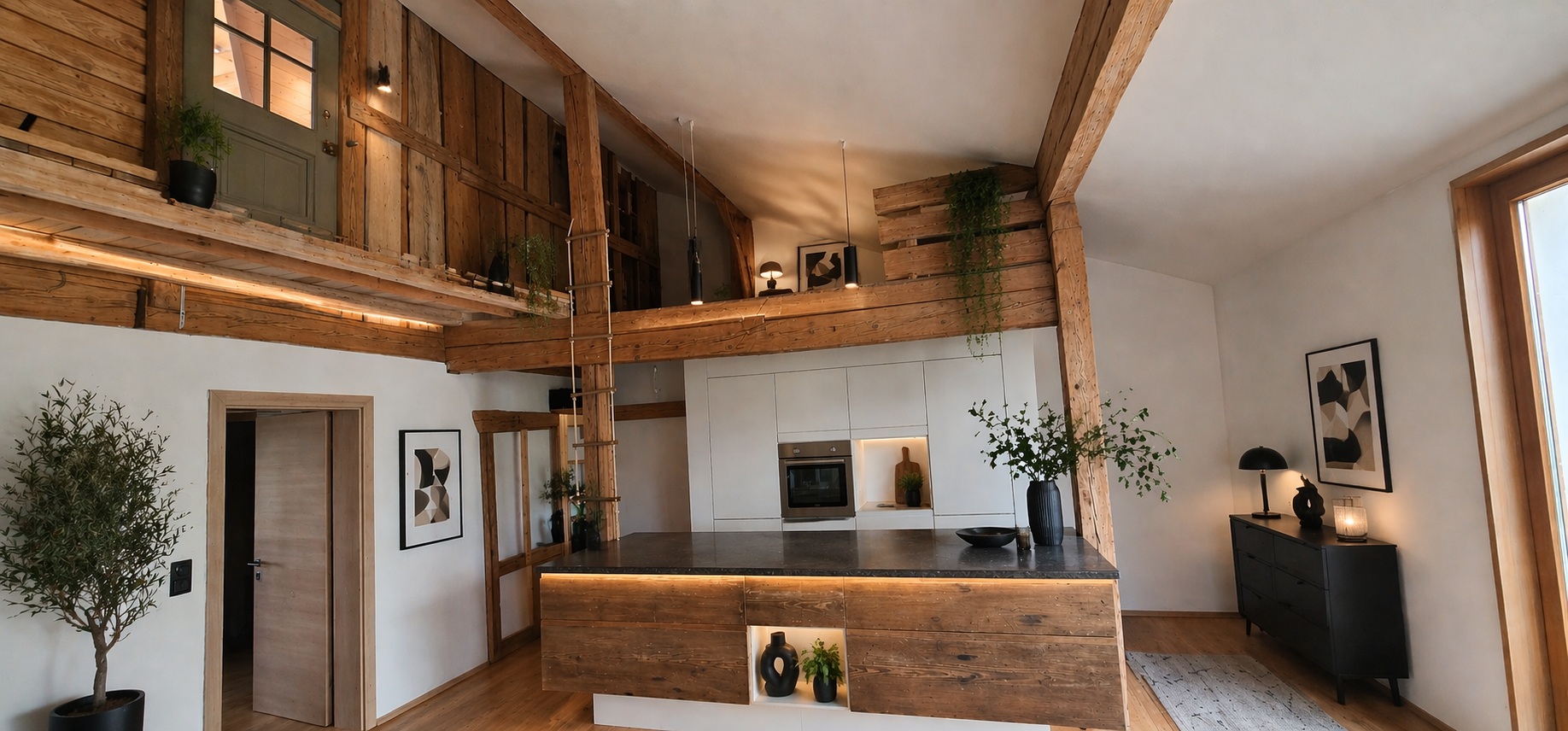 Heute bietet dieser Raum jedoch vielseitige Nutzungsmöglichkeiten und kann ebenso hervorragend als zusätzlicher Wohnraum gestaltet werden. Ob als Atelier, Schlafzimmer, Rückzugsort oder moderner Wohnbereich – das Loft passt sich flexibel den Bedürfnissen seiner Bewohner an.